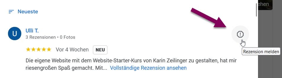 - Melde die Rezension. Klicke auf das Ausrufezeichen oder die drei Punkte neben der Rezension und wähle „Als unangemessen melden.“